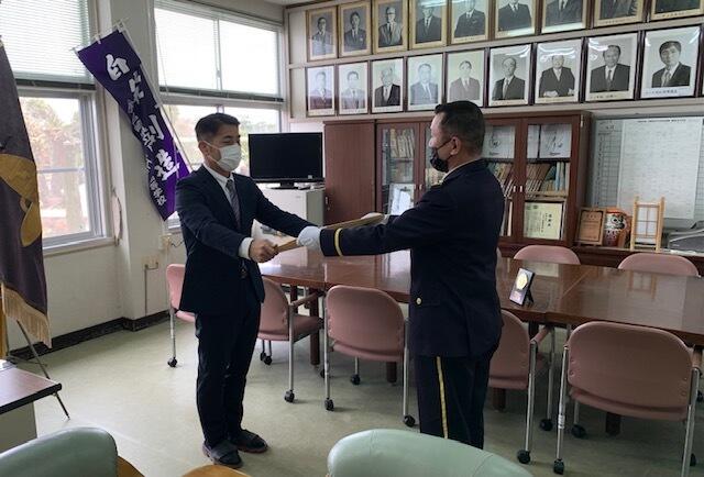 毎年、本校から多くの学生が自衛隊へ入隊しています。このことから、自衛隊宮崎地方協力本部長より感謝状の贈呈がありました。