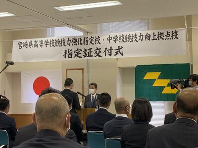 本日、ひなた武道館にて、競技力強化に係る指定証交付式が開催されました。本校男子ソフトボール部が昨年に引き続き強化指定校に指定されました。今年度開催される「四国総体」及び「栃木国体」に向け、さらなる競技力向上が期待されます。そして、5年後に開催される「第81回国民スポーツ大会」で、ソフトボール競技の少年種別が日向市で開催されることから、継続的に強化が図られることを期待しています。