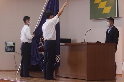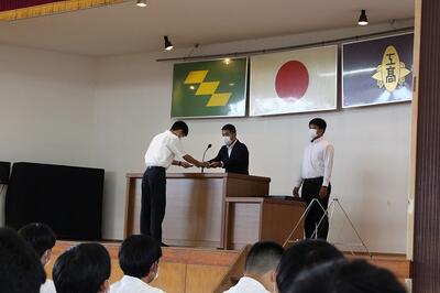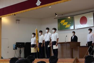 第49回県高校総体ならびに第16回高校生ものづくりコンテスト宮崎県大会に参加する選手の壮行式が行われました。校長激励のあと、校長から稲穂選手(バドミントン部主将)へ団旗を渡し、続いて山本選手(サッカー部主将)が選手宣誓を行い必勝を誓いました。運動部及び技術部の活躍を全校生徒で応援しています。