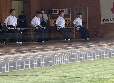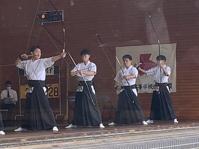本校から出場する最後の競技は弓道競技です。本日、ひなた武道館にて、男子団体の1立目が行われました。明日は2立目、3立目が行われ、的中数の合計で順位を競います。上位16校が決勝トーナメントに進むことができます。明日の頑張りに期待したいと思います。なお、本日、唯一の3年生である桑村選手が4射中3中を的中させ、個人決勝へコマを進めました。残念ながら敗退しましたが、主将としての立ち居振る舞いには大変素晴らしいものを感じました。