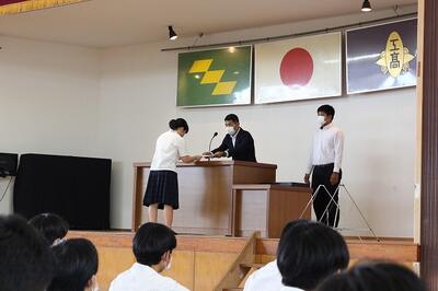 本日、全校朝礼にて県高校総体で入賞した部活動の表彰伝達式が行われました。ソフトボール競技の優勝と水泳個人で林裕輝さんの3位入賞、柔道個人で安藤詩穏さんの3位入賞を全校生徒の前で伝達いたしました。上位大会での更なる活躍を期待しています。