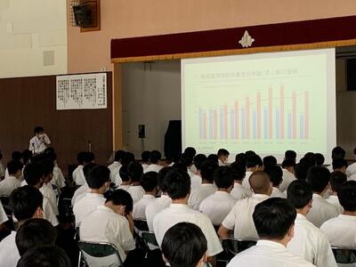 進路選択の幅を広げるとともに、自分に合った職業を考えることを目的に「進路ガイダンス」を実施しました。1限目には、県商工観光労働部・雇用労働政策課の塗木主幹より、「最近の雇用情勢と県の取組」と題してご講義をいただき、本年度の雇用傾向と自分に合った企業を選択することの大切さをお話ししていただきました。2限目からは、県内企業15社による企業説明会、大学をはじめとする進路説明会、そして専門学校等による公務員講座の3部門をブース形式で実施しました。本日のガイダンスには、保護者等も参加して行われました。昨日から求人票の受付が開催されたこともあり、生徒の皆さんも真剣な眼差しで説明を聞いていました。大変、充実した1日となりました。