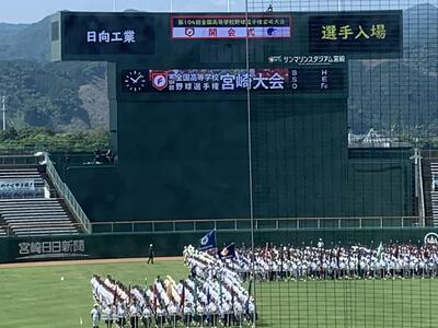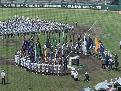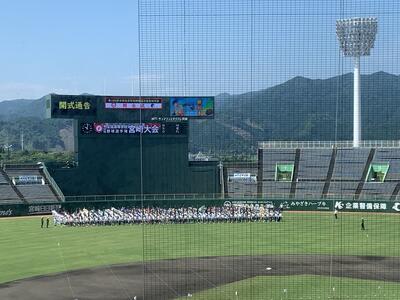 第104回全国高等学校野球選手権宮崎県大会が開幕しました。昨晩の雨が嘘のように晴れ渡り、素晴らしいコンディションのもと開会式が行われました。日向工業は、7月11日の第2試合、サンマリンスタジアムで都城商業と対戦することになっています。副知事の挨拶にもありましたが、熱中症とコロナに気をつけて全力でプレーしてほしいと思います。