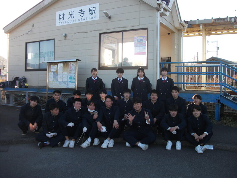 1月10日、列車通学をしている本校3年生が、3年間通学に利用してきた駅へ感謝を込め、財光寺駅の清掃を行いました。