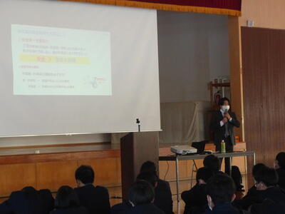 講師は、旭化成株式会社 延岡支社 人事部 延岡人事室の楠原様にお願いして会社概要、仕事の様子、就職に当たっての心構え、準備すべきことなど講演いただきました。