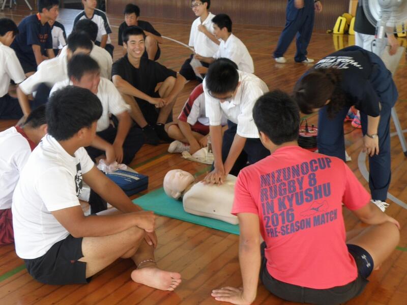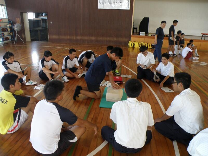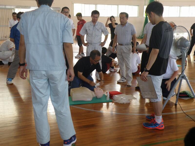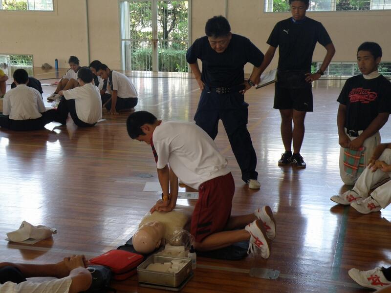 全職員と、各部活動より生徒2名ずつ参加しCPRや事故などにおける応急処置を行いました。