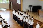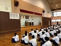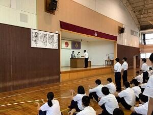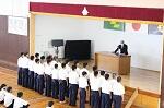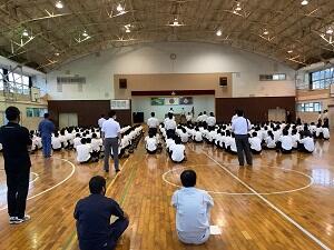感染症予防の対策として、選手と3年生は体育館に集合し、1・2年生は教室よりリモートで参加しました。