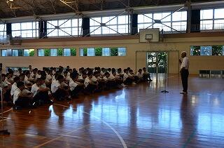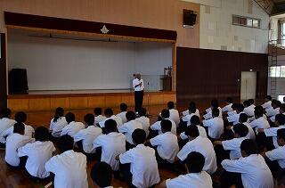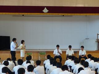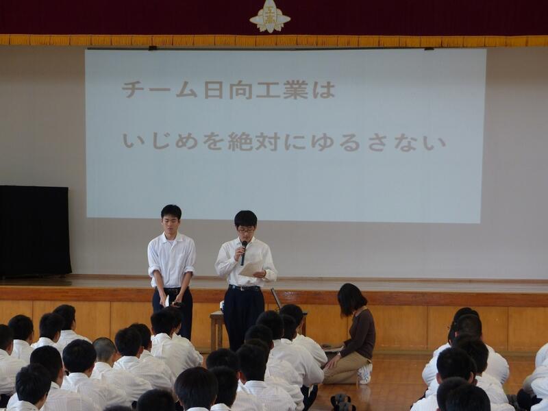 いじめは重大な人権侵害であることを確認し、生徒が安心して学校生活を送るために「いじめは絶対に許さない」という決意とともに宣言文を読み上げました。生徒会からの呼びかけを受け、生徒1人ひとりがいじめについて真剣に受け止め「いじめを許さない」という気持ちを新たにしました。
