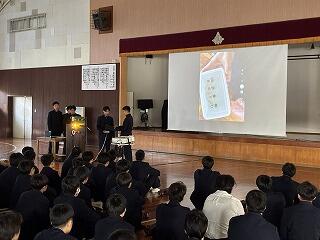 1月30日(金)に、課題研究発表会(全体会)を開催しました。機械科・電気科・建築科の代表生徒が、授業「課題研究」の1年間の研究の成果を全校生徒へ向けて発表しました。