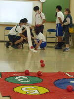 ボッチャや卓球バレーでは、日向工業生は思うようにできず、悔しがるとともにひまわり支援学校の生徒さんの技に感心していました。