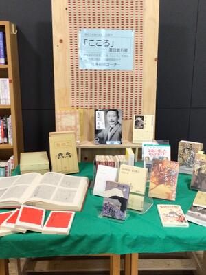 います。漱石の人となり、生み出した作品、年譜など、また担当者が1冊ずつPOPで作品紹介をしています。毎年、『こころ』の単元を学び、まるごと1冊読む生徒も多いです。