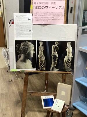 5月16日の通信では、評論文「清岡卓行『ミロのヴィーナス』を学習して」と題し、誰もが知っている芸術作品を目にした著者の実感が簡潔かつ論理的に展開された短い文章です。実際に学んだ10代の彼らはこの作品世界をどのように捉えたのかとても興味深いところです。授業の中で、端々に織り込まれる余談は若い彼らの心をつかむのだろうなと想像します。この作品の展開として、芸術に関する評論も添えました。この展示コーナーの組み立てに、世界美術全集を見開きで展示し、単元作品の掲載されている図書を県立図書館マイラインで取り寄せました。既に絶版になっている良書をこのような形で活用できるのは有り難いことです。この展示中に、著者の他の作品『アカシヤの大連』が借りて行かれました。