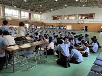 6月27日 高校生と一緒に朝陽祭(体育の部)の団編成が行われました。各団の団長・副団長・リーダーの意気込みを聞き、その後のゲームにより各団の色が決定しました。各団の競技の熱戦、応援合戦が楽しみです。熱中症対策をしながら頑張りましょう!