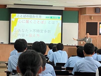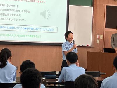 今年度の2年生は、感性の授業の一環で「ラジオ番組」の制作に挑戦します。その学習の一環として、6月19日にNHKのアナウンサーをお招きして、言葉で伝えることの大切さや分かりやすく伝えるときのポイントなどを、実況体験等を交えながら丁寧に教えていただきました。どのような番組ができあがるか楽しみです。