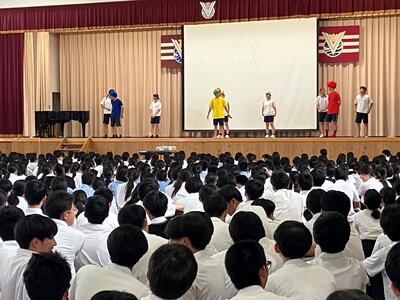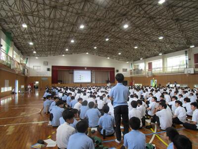 令和7年9月22日 夏休みに東京で行われた「拉致問題に関する中学生サミット」に、宮崎県の代表として参加した奥野瑞紀さん(3年生)が、中学校全校生徒に参加の報告をしました。拉致問題についてより理解が深まったことや、被害者家族の方のお話を聞いて、改めて風化させないために「知ること」の重要性、一人ひとりがら利問題を自分事として捉えることが大切であることなどを語ってくれました。報告を聞いた生徒にとっても、「拉致問題」について考えるきっかけになったようです。