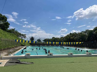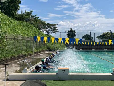 6月27日 今年度初めての水泳の授業がありました。快晴の中、バタ足をしたりバディの足の間を潜って通ったりと、水に慣れる運動を楽しんでいました。暑い夏の本格到来を感じる光景です。