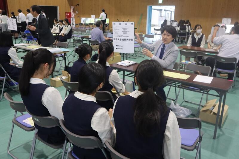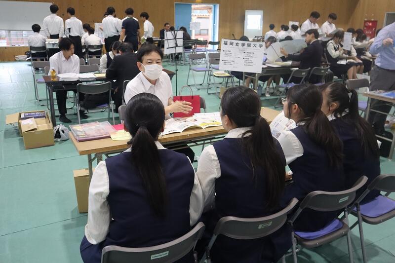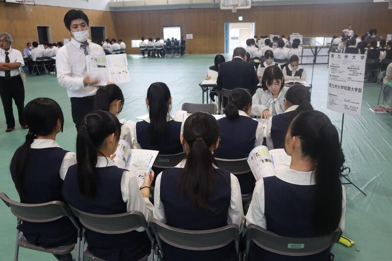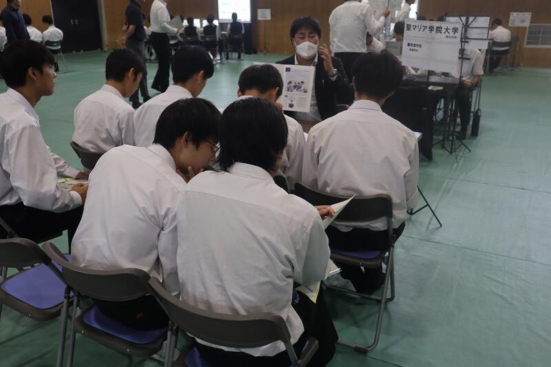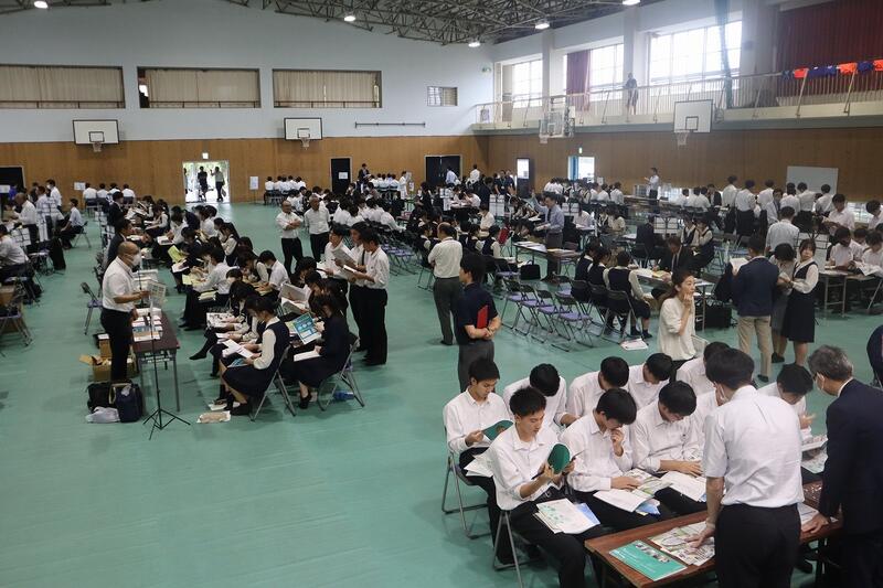 高3対象に、国公立大学との併願校を考える上で、予備知識をきちんと整理した上で選択する一助にすること、私立大学を取り巻く状況を客観的に捉えること、色々な大学の特徴を聞くことによって、自分の進路希望大学を再度確定していく契機とすること等を目的に体育館で実施されました。短期大学も含めて56校の学校がブースを作り、生徒は自分の希望するブースを3つ選び、時間ごとに説明を聞きに行きました。少人数での説明は距離が近く、大学の広報担当の方の説明も熱を帯び、生徒たちも食い入るように聞き、資料を見ていました。企画運営してくださった業者の方々、足を運んでくださった大学関係者の皆様ありがとうございました。49期生はぜひ、熟考選択しつつ、さらなる意欲向上のきっかけにして欲しいです。