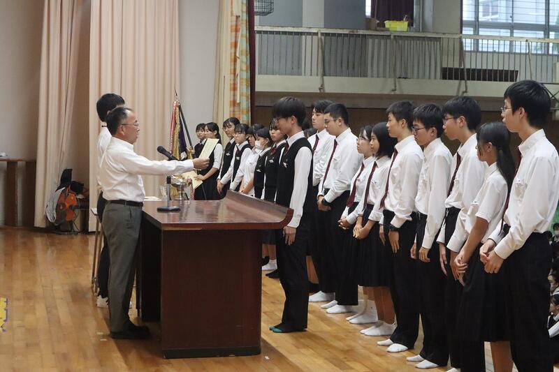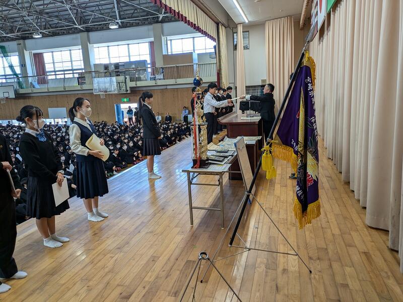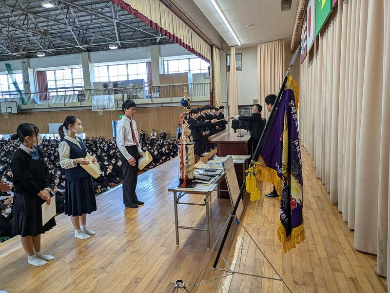 体育館にて、第101期生徒会総務委員退任式並びに第102期生徒会総務委員任命式が執り行われました。