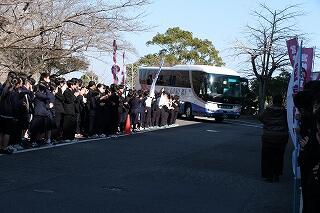 共通テスト前日の下見に出発する際に、恒例の全校生徒による見送りを行いました。応援団によるエールの中、動き出したバスに全校生徒が手を振り声をかけ、各クラスで趣向を凝らした応援メッセージを手に、普通科・理数科・附属中が一体となって、高3生を送り出しました。また、高3生もバスの中から感謝を表現してくれました。
