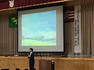 7月4日(火)の6限目と7限目の時間帯に、高校1年生と2年生を対象として、『社会と大学と自分~将来の進路をどう考えるか』という演題で、福岡工業大学入試広報部入試課長 後 大吉朗(うしろ だいきちろう)氏による進路講演会が実施されました。