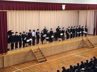 続いて、PTAから卒業生へ、生徒会から卒業生へ記念品が贈呈されました。