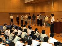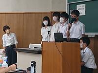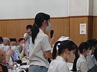 中学部の木幡佳子指導教諭(日本新聞協会NIEアドバイザー)が実践発表を行うにあたり、中学部3年の代表2チーム及び高校生の代表1チームが、パブリック・ディベートを公開してくれました。