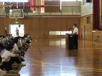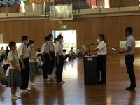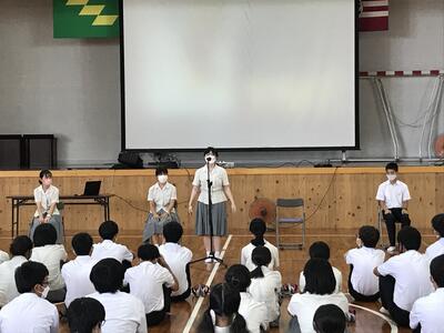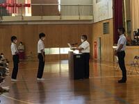 令和4年7月22日(金)、体育館において、1学期終業式を実施しました。終業式の中では、宮崎地区総合体育大会及び第39回全国児童生徒俳句大会の表彰を行いました。また、各学年と生徒会代表による「1学期の振り返り」の発表も行われました。