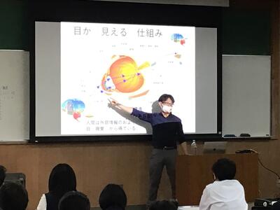 令和4年3月17日(木)、宮崎大学 キャリアマネジメント推進機構農学系 食品科学研究領域テニュアトラック 小川 健二郎 助教授による、2年生の「探究」の授業が行われました。講義題は「見えるは当たり前?目によい習慣と食事~目の研究紹介~」で、宮崎県産食品の健康機能に関する研究等について講話をしていただきました。