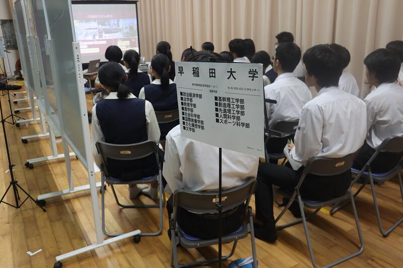 高3対象に、国公立大学との併願校を考える上で、予備知識をきちんと整理した上で選択する一助にすること、私立大学を取り巻く状況を客観的に捉えること、色々な大学の特徴を聞くことによって、自分の進路希望大学を再度確定していく契機とすること等を目的に体育館で実施されました。短期大学も含めて56校の学校がブースを作り、生徒は自分の希望するブースを3つ選び、時間ごとに説明を聞きに行きました。少人数での説明は距離が近く、大学の広報担当の方の説明も熱を帯び、生徒たちも食い入るように聞き、資料を見ていました。企画運営してくださった業者の方々、足を運んでくださった大学関係者の皆様ありがとうございました。49期生はぜひ、熟考選択しつつ、さらなる意欲向上のきっかけにして欲しいです。