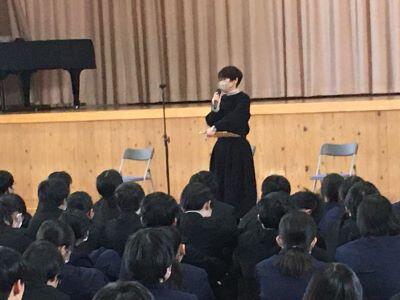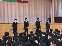 3学期がスタートしました。1年生江藤誓志君、2年生松木宗洋君、3年生中尾悠獅君、生徒会中山寛仁君が、新年を迎えてそれぞれの目標を述べました。気持ちを新たに、次の学年への準備期間の3学期を充実させていきましょう。教頭先生のお話は、「ひとり旅」がテーマでした。皆さんのデビューはいつになるでしょうか。