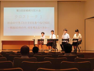 8月18日 宮日会館で行われたNIE県大会プログラムの一つである小・中・高校生によるクロストークに、本校3年の岩本佑都さんが登壇者として参加しました。「戦後80年の今、何を考えるべきか」というテーマで、4人の参加者がそれぞれの思いを体験等を交えながら語ってくれました。「物事を深く考えるために心がけていることは?」の問いに、「物事を多角的に見ること」、「自分の目で見たり、自分の耳で聞いたりすること」、「いろんな物事を自分事として捉えること」などと答えていた子どもたち。そんな子どもたちの声に、大人も大いに学んだ大会でした。