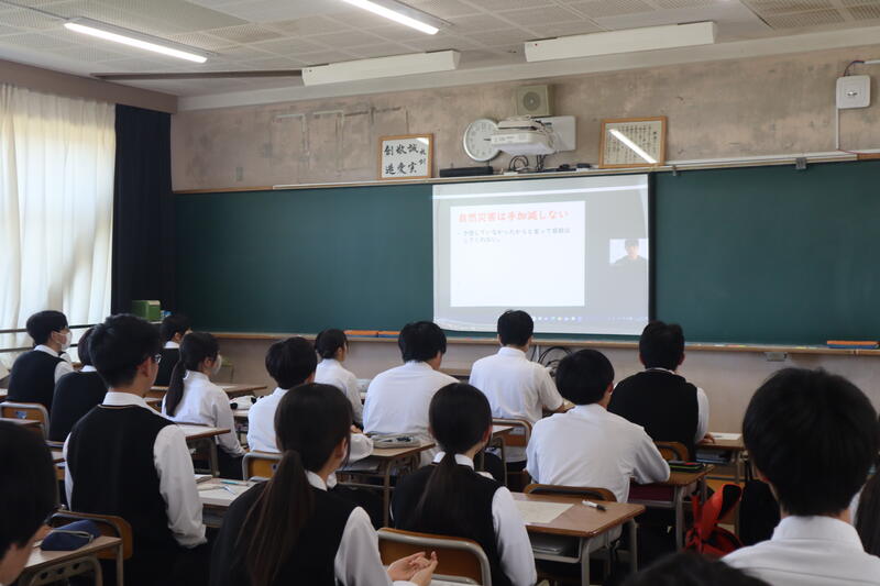 R6.05.10 全校生徒に向けてリモートで防災学習が行われました。記憶に新しい能登半島地震、最近宮崎でも頻発する地震と身近な問題だけに、生徒たちも真剣に耳を傾け、考え、議論していました。
