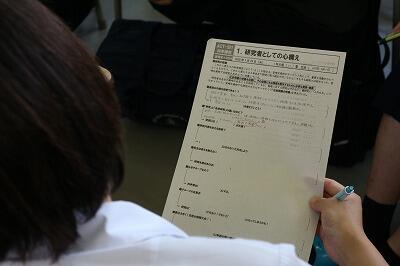 ①初めに「なぜ探究活動が必要なのか?」「研究者としての心構え」についてワークシートを使いながら説明を行います。
