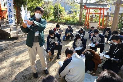 青島神社では2グループに分かれて、神社前の地質観察と、神社内の植物観察を行いました。