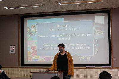 (画像は、お題を提示する本校ALTの先生です。)