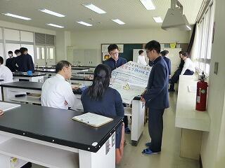 こちらは、新入生に総合実験室の説明を行っていますね。