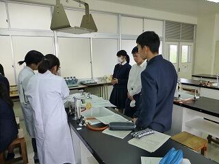 午前の部では、サイエンス科の1年生と一緒に食の安全分析センターへ見学に行きました。センターの甲斐場長の講話を聴き、安藤事務長と女性研究者の酒井主任研究員による実験教室を受けて、実際に持ち込んだオレンジやレモンなどの残留農薬の分析を行いました。