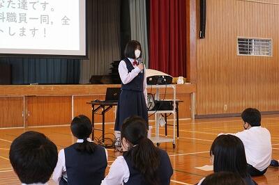 在校生歓迎の言葉を2年生の代表生徒が述べました。私たちも分からないことばかり。だからこそ,つながりを大事に一緒に頑張っていきましょう,と話してれくました。