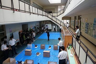 今回は,フィルムケースと入浴剤を使ったロケットをチームで作り,2回ロケットを飛ばし,合計点数を競うゲームを行いました。飛ばした距離によって点数が入りますが,的に当たると大幅に点数が入るルールになっています。1回目のロケット飛ばしが終わると,各チーム試行錯誤しながら,より遠くに飛ばそうとロケットを改良している姿が印象的でした。