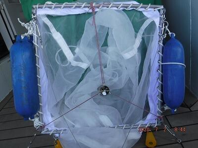 曳航後は、海水をかけて内側に付着した資料を先端のコッドエンドに流し込みます。