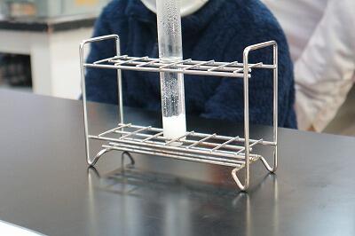 1つ目は「スノードーム」です。塩化アンモニウムの入っている試験管に蒸留水を入れ,ガスバーナーで加熱します。加熱しながら塩化アンモニウムが全て溶けるまで,試験管を振ります。