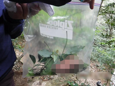 さて、採取したカンゾウタケは、葉っぱと一緒に密閉します。