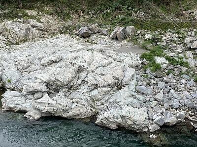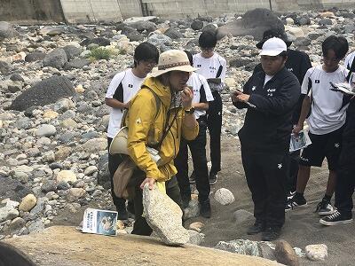 「日之影町旧役場前の河原」へ移動し、地質に関する観察を行いました。