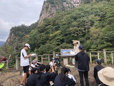 尾鈴山火山の噴火による溶結凝灰岩や柱状節理が作る景色について学びました。