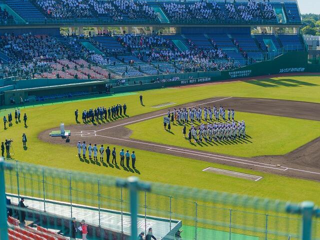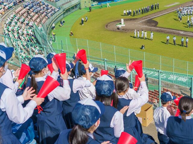 令和3年4月21日、サンマリンスタジアムで第42回四校定期戦が行われました。本校野球部は、宮崎南高校に敗れてしまいましたが、溌溂としたプレーが光りました。応援団以外は声を出しての応援はできませんでしたが、この日に向けて練習を重ねてきた応援団と生徒による応援が選手らのプレーを後押ししました。