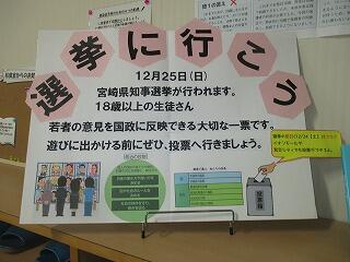 12月25日(日)は、宮崎県知事選挙の投票日です。夜間部の生徒の中には、すでに投票権を持つ生徒がいます。私たちの故郷をよくしてくれる知事を選ぶ大切な選挙です。自分の考えを投票という形でしっかりあらわしましょう。