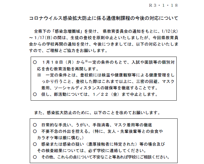 自宅を出る前に検温し平熱より高い場合は登校できません。また、学校敷地に入ったら、マスク着用を守りましょう。