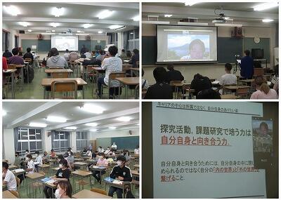 7月13日(火)の「総合的な探究の時間」は60分に拡大されて実施されました。GlocalAcademy代表理事岡本尚也氏と宮崎東高校をリモートで結んで、在校年次生徒全員が参加し、その中で生徒四人が行った中間報告に対して、岡本氏から指導助言をしていただきました。