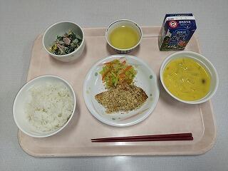 麦ご飯・魚のパン粉焼き・ビーンズサラダ・カボチャスープ・牛乳