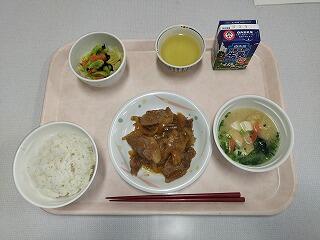 麦ご飯・豚肉の生姜焼き・キャベツの甘酢和え・小松菜味噌汁・牛乳